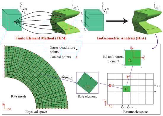 - Hughes, T.J.R.; Cottrell, J.A.A.; Bazilevs, Y. Isogeometric Analysis: CAD, Finite Elements, NURBS, Exact Geometry and Mesh Refinement. Comput. Methods Appl. Mech. Eng. 2005, 194, 4135–4195. [Google Scholar] [CrossRef] [Green Version]