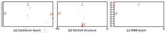 Three benchmarks with boundary and load conditions: (a) Cantilever beam with boundary and loads conditions; (b) Michell structure with boundary and loads conditions; (c) MBB beam with boundary and loads conditions.