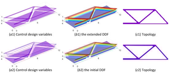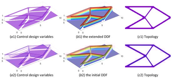 The optimized designs of the MBB beam: (a1–c1) The ITO method using the extended DDF; (a2–c2) the ITO method using the initial DDF.