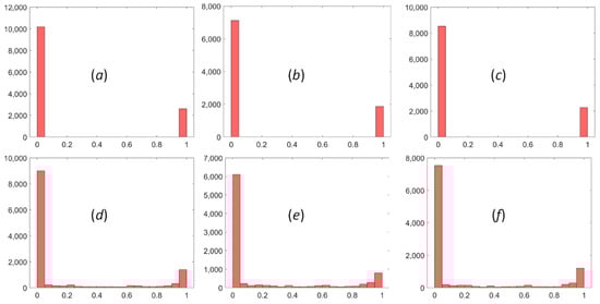 The data layout of the density values of the control-design variables in the optimized designs presented: (a) the corresponding layout in Figure 10(a1); (b) the corresponding layout in Figure 11(a1); (c) the corresponding layout in Figure 12(a1); (d) the corresponding layout in Figure 10(a2); (e) the corresponding layout in Figure 11(a2); (f) the corresponding layout in Figure 12(a2).