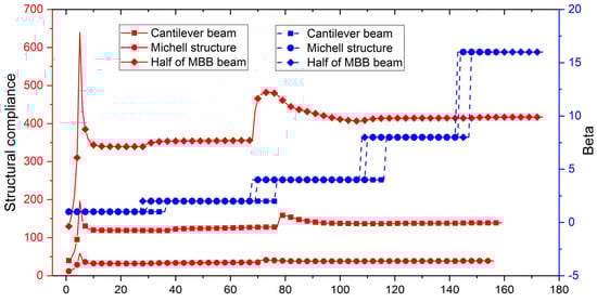 Convergent histories of structural compliance and parameter Beta from Figure 15a–c.