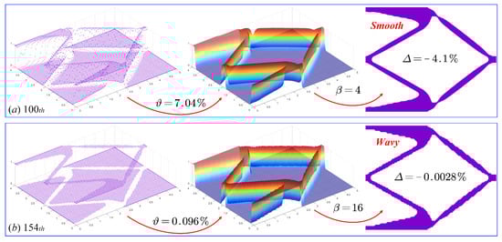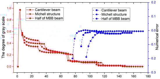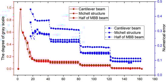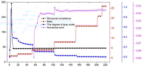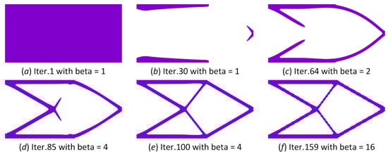 In Figure 27, the optimized designs of the Michell structure, L-type structure, and Bridge-type structure are provided, including the smooth structural topologies that can be manufactured and the nearly pure 0–1 designs, which show the effectiveness of the current ITO method with the extended DDF. The convergent histories of the structural compliance, the parameter Beat, the degree of gray scale, and the numerical error of the Michell structure are provided in Figure 28. As can easily be observed, the iterative trajectories feature smooth variations and a stable convergence process. Some of the intermediate topologies of the Michell structure are presented in Figure 29. The role of the threshold projection in the earlier iterations focused on generating a complete loading-transmission path. In the latter iterations, the increase in the parameter Beta in the threshold projection gradually transformed the smooth design into a wavy topology with a 0–1 density layout.