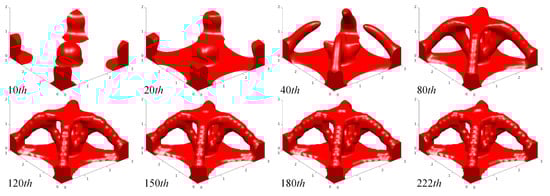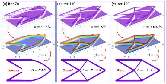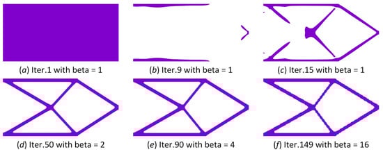 Additionally, several intermediate cantilever-beam topologies are presented in Figure 17. We can easily see that the earlier iterations with the increase in the parameter Beta facilitate the generation of the key structural members in the design domain, until a full loading-transmission path is generated in the final topology. In the latter iterations, the increase in the parameter Beta aims to push all the control-design variables towards 0 or 1 and form a nearly pure 0–1 distribution of the extended DDF. However, the FEM-based three-filed SIMP method with the ersatz material model has no ability to seek a reasonable topology in a stable process, as presented in Figure 14(a2–c2). With the increase in the finite elements in the FEM to improve the numerical precision, it can enhance the stability of the optimization to find several ineffective designs, as shown in Figure 3. Hence, the higher numerical precision of IGA in replacing the FEM can maintain the effectiveness of the ITO method with the ersatz material model to find an appropriate design. Hence, it is indispensable to develop the framework of the ITO to seek the optimal material distribution in the design domain.
