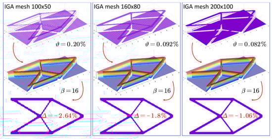 - As shown in Figure 4, if the design domain uses a denser mesh, the numerical precision is improved and the optimization with the ersatz material model and threshold projection can find relatively appropriate designs. This reveals that numerical precision has a significant influence on the ability of threshold projections to generate structural topologies. However, increasing the number of finite elements results in a prohibitive computational cost, Although the optimization can find solutions to some extent, the densities dramatically change in the optimization and cannot converge in a stable process. Hence, the use of IGA to unify CAD and CAE in an integrated model with greater numerical precision at the same finite elements can offer a powerful alternative to FEM for solving unknown responses [,].