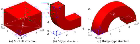 In this subsection, the main intention is to discuss the utility of the proposed ITO method with the extended DDF and ersatz material model in the optimization of 3D structures. In Figure 26, three different 3D structures with loads and boundary conditions are defined, including Michell structure, L-type structure, and Bridge-type structure. The related optimization parameters of the three benchmarks are provided in Table 3, namely, the orders of the NURBS basis functions in three parametric directions, the number of control points or control-design variables, the number of IGA elements, and the maximum material consumption.
