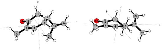 EQ1, EQ2, and EQ3 conformations of carvone, respectively, as reported by Reference [24]. The conformations are each presented in the principal axis system. EQ2 is the most stable conformer and the one from which the transition cycle of Figure 4 was derived.
