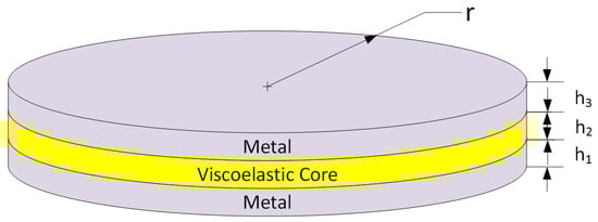 where is the Young’s modulus and is the Poisson ratio of the kth layer. If the material is frequency- and temperature-dependent viscoelastic, it converts to , where is the complex modulus of the viscoelastic core with the frequency in Hertz. Hamilton’s principle is used to derive the governing equations for the vibration analysis of the circular sandwich plate: