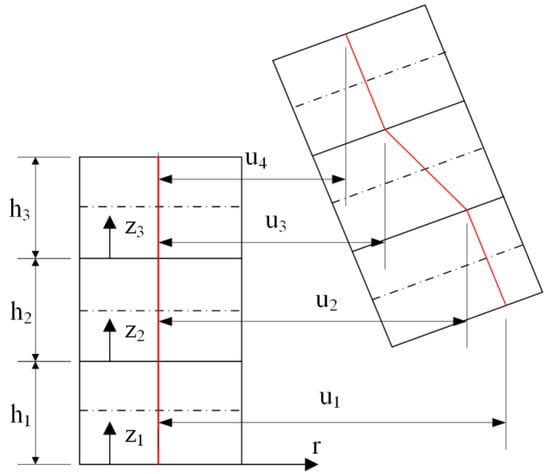 where is the thickness, is axial and is the transverse displacement field, is the axial displacement at and is the axial displacement at for the kth layer. In cylindrical coordinates, the strain displacement relations can be given as follows: