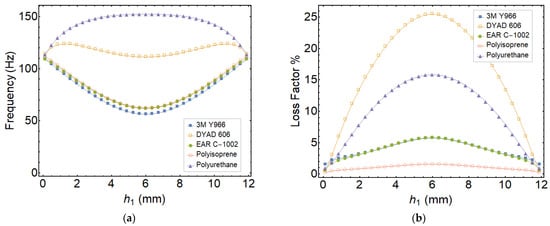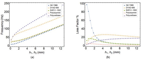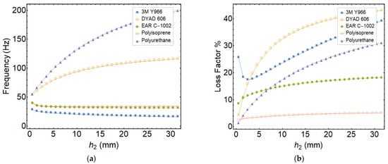 However, this mechanism loses its efficiency when the core thickness becomes too large compared to the face layers, and the modal loss factor converges to the material loss factor. In general, the modal loss factors increase with h2 due to the increase in damping material mass, as expected. One exception is the 3M Y966 material at small values of h2. The reason seems to be that the material loss factor shows significant variation at around 30 Hz, which is the fundamental frequency of the sandwich plate. As the core thickness increases, the natural frequency decreases, as well as the material loss factor. This can be seen in Figure 5a,b in detail.