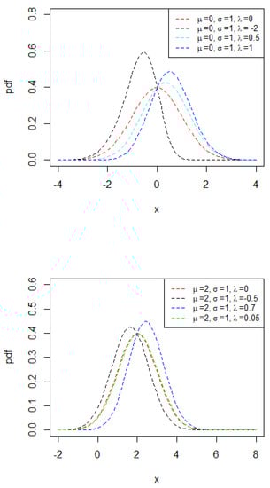 where is the location parameter, is the scale parameter, is the skewness parameter, and and are the probability density function and cumulative distribution function of the normal distribution, respectively. We denote it by . Moreover, the effect of on the skew normal distribution will be graphically shown in Figure 1.