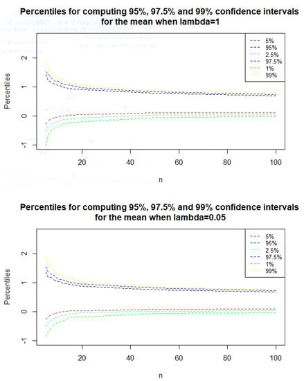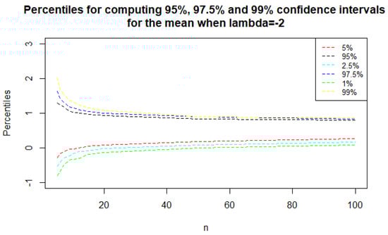 Without loss of generality, we choose , , and the values of are chosen as −2, 1, 0.05, respectively. The percentiles for calculating confidence intervals based on different sample sizes are given in Table A1 with the Monte Carlo experiments. Figure 2 shows the percentiles of computing , , , , and confidence intervals for the mean based on the results obtained from Table A1.