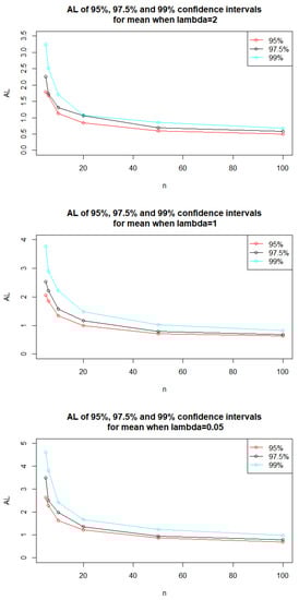 From Table A1, we can find that the distance between the upper and lower percentiles of the decrease as the sample size increases. To evaluate the performances of the proposed confidence interval constructed by the pivotal quantity approach, we carried out simulation studies with the same values of given in Table A1. The coverage probabilities (CP), average length (AL), and associated standard deviations (SD) were calculated based on the R software. For each of the generated sets, we used the R code with 10,000 runs to compute confidence intervals. The percentage of these 10,000 confidence intervals that include the actual mean value is an estimate of the CP. The AL and SD are estimated similarly. The corresponding results for sample sizes of n ranging from 5 to 100 and different values of are displayed in the following Table A2. See the Appendix. The values of AL in Table A2 are displayed in Figure 3.