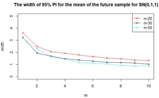 As can be seen from Table A3, the predicted interval length decreases with the increasing of m and n. Figure 4 also visually illustrates the above conclusion. And we can conclude that of the mean of the future data is , when the current sample size is 20 and the future sample size is 5, where and can be estimated from the sample size 20.