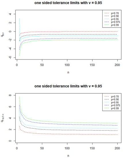 From Table A4 and Figure 5, we can see that the lower bound of one-side tolerance interval increases, the upper bound of one-side tolerance interval decreases, and the interval length of one-side tolerance interval decreases as the sample size increases, which means that the larger the sample size is, the smaller and more precise the intervals are.