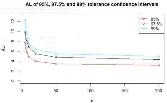 Table A5 selects several sample sizes for simulation and gives the CP and AL of the tolerance confidence interval. Repeat 10,000 times to get the SD of the length of the tolerance confidence intervals. The values of AL in Table A5 are displayed in Figure 6.