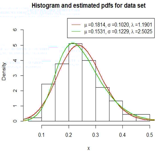 Furthermore, the Kolmogorov-Smirnov (K-S) test, the Anderson-Darling (A-D) goodness-of-fit tests, as well as the p-value (pval) are reported in Table 3. The K-S statistic (based on the MLE of the parameter , , and ) is 0.0531 and the corresponding p-value is 0.9613. The K-S statistic (based on the our method of the parameter , , and ) is 0.0424 and the corresponding p-value is 0.9969. Therefore, the data set is reasonably fitted for the skew normal distribution. The fitting curves of the probability densities from these two methods are also displayed in the Figure 7.
