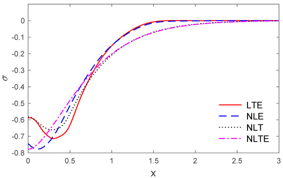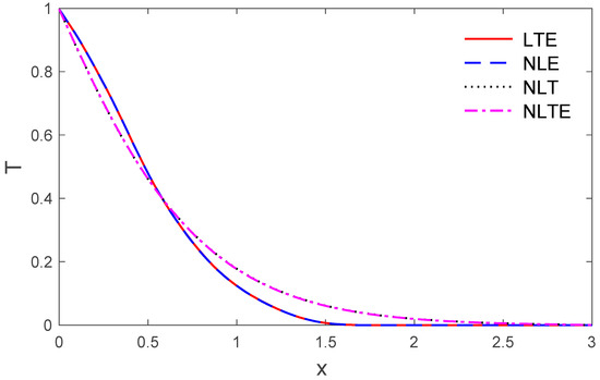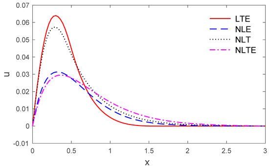 The temperatures, the displacement, and the variations of stress along the distance are numerically calculated using the nonlocal thermo-elastic (NLTE) model. Figure 1, Figure 2, Figure 3, Figure 4, Figure 5, Figure 6, Figure 7, Figure 8 and Figure 9 show the computations of physical values (numerically) via the distance , the effects of nonlocal parameters, the heating ramp type, and the relaxation time based on the physical data set.
