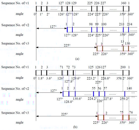 Figure 2 gives an example of the consistency of the sampling points in a probe arrangement of 0–127–225°. When N = 360, the angle interval is 1°, and the three probes share the same sampling-points group. However, when N = 200, probe v2 has sampling points inconsistent with the other two probes.