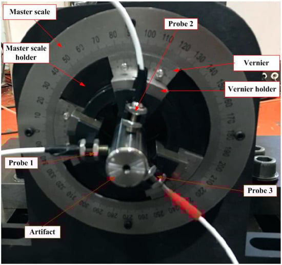 Figure 3 shows the test rig. The test section was provided by an artifact clamped at the front end of the spindle. Three eddy-current-displacement sensors were fixed on the vernier holder, which was installed on the master scale holder, and could slide circumferentially to adjust the installation angle of the sensor. The reading of the angle was obtained from a combination of master scale and vernier.