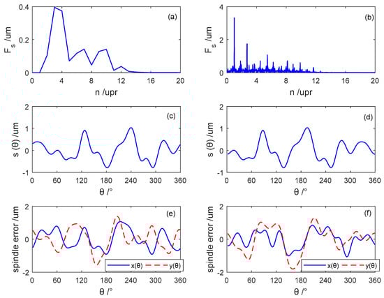 Intermediate and final results of the frequency-domain solutions under the two average schemes in Experiment 1: (a) the frequency-domain roundness error in the previous average scheme; (b) the frequency roundness error in the latter average scheme; (c) the time-domain roundness error in the previous average scheme; (d) the time-domain roundness error in the latter average scheme; (e) the spindle error in previous average scheme; (f) the spindle error in the latter average scheme. “upr”, short for undulation per revolution, is used to stress n as a rotation-harmonic number.