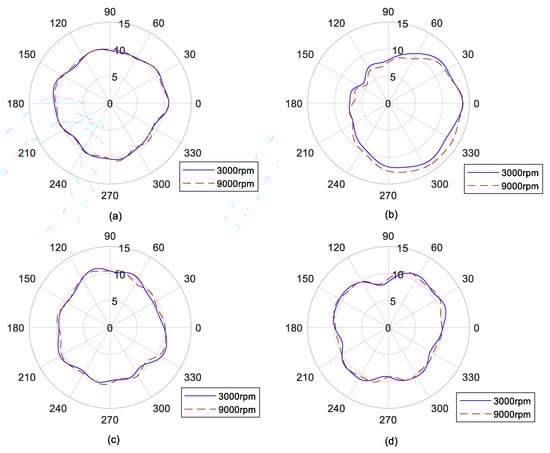 The effect of rotational speed on the polar plot of the frequency-domain solutions: (a) the roundness error under previous scheme; (b) the roundness error under the latter scheme; (c) the spindle error under the previous scheme; (d) the spindle error under the latter scheme. Units: μm.
