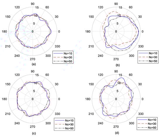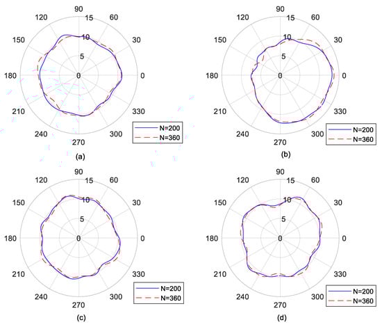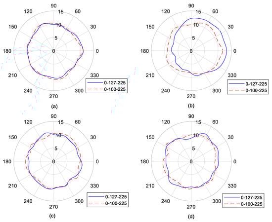 The effect of probe arrangement on the polar plot of the frequency-domain solutions under the two average schemes: (a) roundness error under the previous scheme; (b) roundness error under the latter scheme; (c) spindle error under the previous scheme; (d) spindle error under the latter scheme. Units: μm.