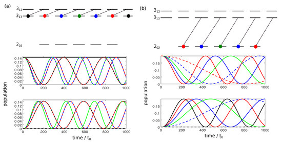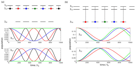 Figure 1 shows the population dynamics for the different initial states during the interaction with a linearly polarized field along the laboratory-fixed z-axis. We assume microwave fields with constant amplitude and with frequencies in Figure 1a and in Figure 1b. The relevant rotational states are sketched on the top, with the initially occupied states indicated by colored circles. Since for a z-polarized field, only transitions with occur, the dynamics is divided into five individual two-level systems with Rabi frequencies