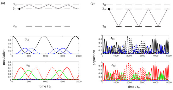 Population transfer between the rotational states and (a) and and (b) as in Figure 1 but for an x-polarized field. Green lines correspond to states with , solid and dashed blue, red and black lines to states with and and , respectively.