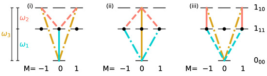 i.e., if the three degenerate states of level are populated, such a three-wave mixing pulse sequence cannot induce complete enantiomer selective excitation. This can be rationalized with the help of Figure 4. A three-wave mixing cycle can be realized by three different combinations of x-, y- and z-polarized microwave pulses, as seen in panels (i)–(iii). Here, the transitions induced by x-, y-, and z-polarized fields are marked by dashed, dotted, and solid lines, respectively, with the colors indicating the frequencies of the corresponding fields. The degenerate initial states are indicated by black circles. The three-wave mixing cycle (i) only affects the initial state with , while the cycles (ii) and (iii) transfer the population from the initial states with . Thus, only one or two of the initially populated states are part of each closed three-level cycle and therefore only part of the initial population can be selectively transferred to different rotational states.