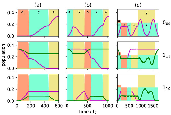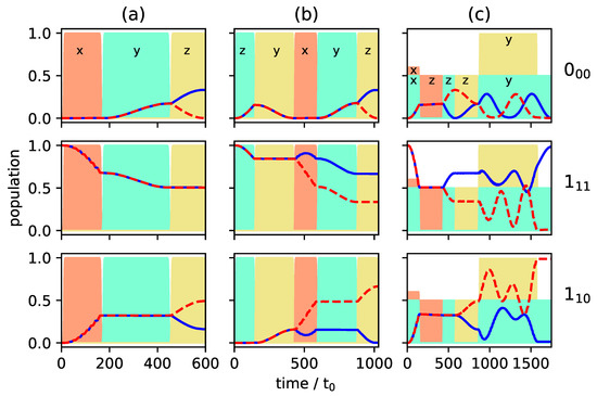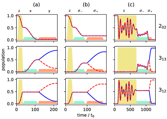 For simplicity we consider only a single initial state, depicted by the black dots in Figure 2a,b. For the simulation shown in Figure 2a, the initial state is , and the frequency of the microwave pulse . An x-polarized field induces transitions with . Thus, the dynamics cannot be described by a two-level system. Instead, the field couples all states connected by the dashed lines in the top panel of Figure 2a and population is transferred through the complete manifold of M-states. Nevertheless, complete population inversion occurs between the states and with all states in between only partially populated. This picture changes for transitions with , as shown in Figure 2b: Rapid oscillations between the states and with incomplete population transfer are observed before other states are substantially populated. In this case, population inversion between the states with maximal value of ( and ) remains incomplete. The observation in both cases can be rationalized in terms of the three Rabi frequencies relevant to the seven states that are coupled by the x-polarized pulse (note the symmetry around ). In Figure 2a, these are , and , i.e., strictly periodic. In Figure 2b the ratio between the three frequencies , and is irrational and thus not strictly periodic. Note that, for excitation with a single pulse, the population transfer induced by x- and y-polarized fields is identical. The corresponding transition matrix elements only differ by sign [24]. This will become important for cyclic excitation with three orthogonal pulses.