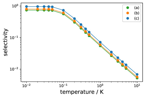 with Q defined by and , and . In molecular beam experiments, rotational temperatures in the range of 1 - 10 K can be achieved, which result in non-neglibile initial thermal population of all rotational levels involved in the three-wave mixing cycle. Figure 10 shows the maximal selectivity for the excitation schemes (a)–(c) in Figure 8 in a semi-logarithmic plot for initial temperatures between T = 10 mK and 10 K. For K, thermal occupation of the upper two levels becomes negligible and the selectivity approaches its maximal value, whereas it gets exponentially reduced for rotational temperatures T > 0.1 K. Importantly, the modified excitation scheme using synchronized circularly polarized pulses (Figure 8c) results in a larger selectivity than standard three-wave mixing with linearly polarized fields (Figure 8a) and three-wave mixing with circularly polarized fields without synchronization of the individual three-level systems (Figure 8b) for every temperature.