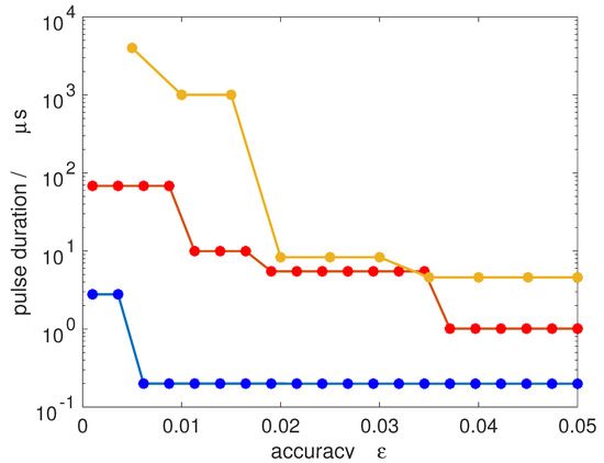 In Figure 11, we show the pulse duration required to achieve a 50/50-coherence for all M-states within an accuracy defined by . Transitions from to (blue dots), to (orange dots) and to (yellow dots) are considered, assuming a microwave field with an intensity of 10 W/cm2, comparable to field intensities used in current microwave experiments [15]. A jump in the pulse duration occurs whenever the number of Rabi cycles has to be increased to obtain a smaller value of . Since the degeneracy increases with increasing J, the pulse duration required for very accurate synchronization increases. For a rotational subsystem with initial state , a 50/50-coherence with an accuracy below one per cent can be achieved within less than 1 μs. Starting with rotational states with , one per cent accuracy already requires a pulse duration of about 10 μs. This is of the same order as typical coherence times in current microwave experiments. Of course, the absolute value of the pulse duration can in principle be reduced by employing stronger pulses.