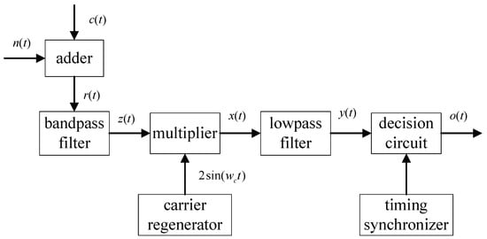 The MPSK demodulation process typically consists of two BPSK demodulation. Figure 1 illustrates the simple case of coherent demodulation for BPSK [28,29]. First, the received BPSK signal is filtered to eliminate out-of-band noise using a bandpass filter. Afterwards, the filtered output is multiplied by a sin wave , resulting in an output that is twice the frequency of the input signal. The high frequency components in are removed by the lowpass filter. The signal is then passed to the decision circuit. Based on the synchronized clock in the timing synchronizer module, we obtain the final result which recovers the binary data stream. In particular, the key component in BPSK demodulation is the carrier generator. It needs to yield a local carrier with the identical frequency and phase as the input signal . However, the local carrier may not be properly generated, leading to a phase difference between the generated carrier and the received carrier, resulting in negative consequences for demodulation [30,31,32].