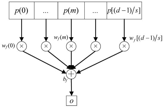 where is a parameter known as bias, are weights, and o denotes a single unit. According to Equation (15), we can construct a structure to depict the full connection, as shown in Figure 5. In BPSK demodulation, we only need one output unit represented by bit 1 or 0. Thus, the full connection costs multiplications and additions for one output.
