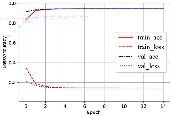 The accuracy in Figure 6 takes a value very near 0.95 and the loss is close to 0.15. The training and validating accuracies improve as we train, while the losses decrease. In particular, the four curves change rapidly in the first two epochs, and the top and bottom parts tend to be 0.95 and 0.15, respectively. After the four epoch, the two accuracy curves almost overlap as well as the two loss curves. The training accuracy is stable, leading to a 94.4% accuracy.