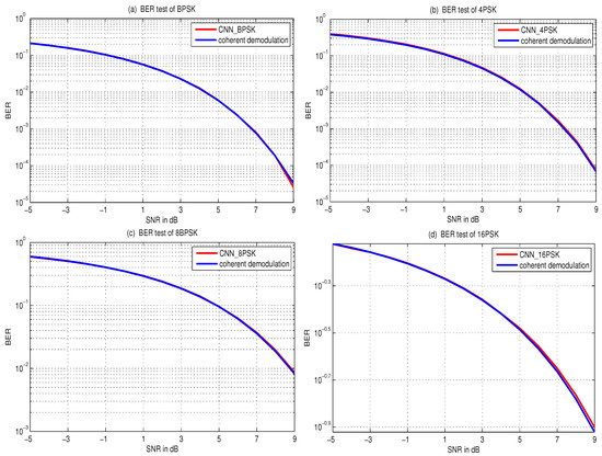 This part presents the demodulation performance of CNN-MPSK. In this experiment, the SNR is snr_db = [−5, −4, −3, −2, −1, 0, 1, 2, 3, 4, 5, 6, 7, 8, 9] in decibels. We need to restore the snr_db to the initial value and perform conversion. We utilize additive white Gaussian noise (AWGN) to simulate channel interference. The tested data for each SNR is 5 million bits, so the total number of noised data flows to CNN-MPSK network is 100 million. With the trained parameters, we predict the noised data and thus obtain the demodulated curve for BPSK, 4PSK, 8PSK and 16PSK, as shown in Figure 7. The blue BER curve is obtained by coherent demodulation. The horizontal axis represents the SNR in dB, while the vertical axis is the BER. The BER curves of the four demodulations from the CNN structure overlap heavily with those based on the conventional coherent demodulation.