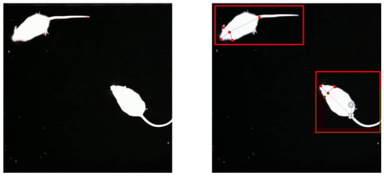 The keypoints of our dataset were the five most easily observable in the top-down perspective (Figure 3). At the same time, these five keypoints can simulate the daily behavior of most mice. Therefore, they can be well applied in the laboratory environment. To obtain the annotated 2D pose data of mice, we divided the annotation task into two parts. In the first part, we used the LabelImg application [45] to annotate the mouse locations. Then, we cut out the mouse images from the original images based on the mouse localization coordinates.