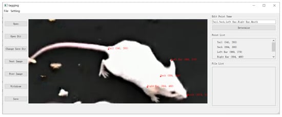 In the second part, we performed keypoint annotation on cropped mouse images. To facilitate the execution of keypoint annotations, we produced a universal mouse pose estimation labeling software (Figure 4). The software is based on PyQt5, a Python language implemented on the basis of the graphical programming framework Qt5, which consists of a set of Python modules. The PyQt5 API has more than 620 classes and 6000 functions. These well-packaged classes and functions make it easier and more convenient for users to instantiate classes and call functions. It is a cross-platform toolkit that can run on all major operating systems, including Windows, Linux, and Mac OS. All the advantages shown above contributed to our choice of PyQt5 as the means to process the images. It can annotate not only the joints of mice, but also the joints of other animals in the image. At present, no labeling software on the market is specifically aimed at labeling the keypoints of objects in an image. Our self-created annotating software is based on the python3.6 and PyQt5 libraries. The basic functions of this software are to visualize the labeling process and save the coordinates of the annotated keypoints in a text document file. At the same time, in order to improve the efficiency of the labeling, we also added some functions that facilitate the labeling process, such as adding a quick interface, switching between multiple files, and removing labeling points.