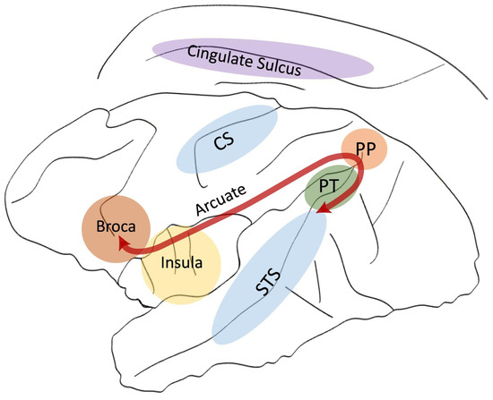The most emblematic marker of the lateralised language organisation is the Planum Temporale (PT), which is located within the Sylvian fissure and is part of the auditory association cortex [] and Wernicke’s area []. In adults, left hemispheric lesions in this region result in severe language comprehension and production deficits [,,]. Therefore, many studies have shown the particular functional significance of the PT in the left hemisphere for a variety of auditory language processing [], including the main perception component of the audio–motor loop for phonological processing []. Interestingly, in preverbal newborns, the functional implication of the left PT was highlighted from birth [,,].