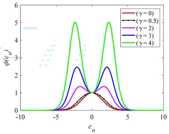 The term in Equation (20) has a significant impact on the stability of the CRKRSL algorithm under non-Gaussian noise since CRKRSL can suppress large outliers () with a small . Figure 1 shows the relation between and the error . It is clear to see that in CRKRSL is bigger than in CRMCC, when the error is small. (Note that if ). Moreover, when , the CRKRSL degenerates to an efficient CRMCC [26] algorithm and reaches the maximum at . When , reaches the maximum at local points around with a larger increment, resulting in a faster convergence speed and higher accuracy than CRMCC.