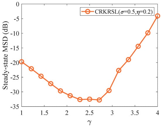In this part, the input dimension m and constrained dimension q are set as and , respectively. The noise considered here satisfies the following conditions, i.e., Gaussian noise and mixed noise . To reflect the influence of risk-sensitive parameter on the MSD, the relations between and steady-state MSD are shown in Figure 2 and Figure 3 under different noise models. From Figure 2, one can see that CRKRSL has a stable steady-state MSD under Gaussian noise. Therefore, has little influence on the performance of CRKRSL. From Figure 3, it is observed that the CRKRSL is sensitive to under mixed noise with model (a) and achieves the lowest steady-state MSD around . Therefore, we choose for the following algorithm comparison in Figure 4 and Figure 5. Note that denotes the shape parameter in the CLLAF algorithm. All necessary parameters are given in the figures.
