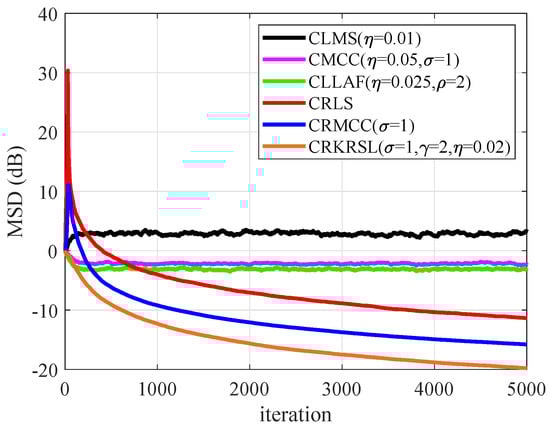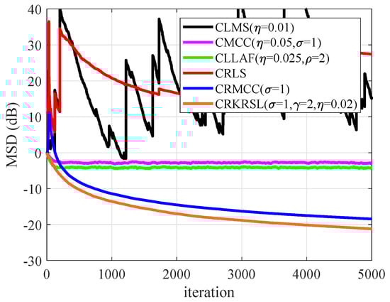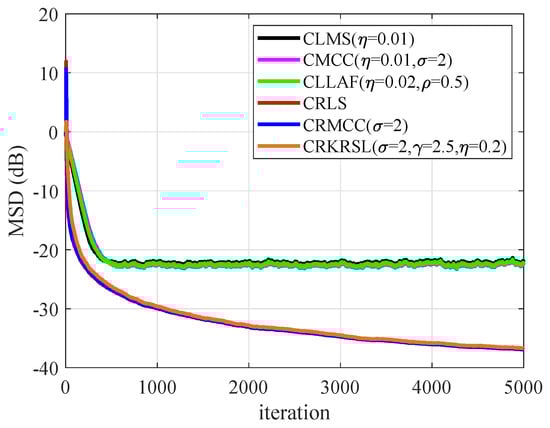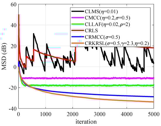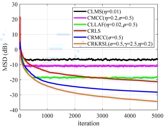 To test the performance of CRKRSL under mixed noise with model (b), Figure 6 gives the MSD results of all mentioned algorithms. One can see from Figure 6 that CRKRSL, CRMCC, CMCC and CLLAF show strong robustness to outliers, and CRKRSL has the lowest MSD, whereas the CLMS and CRLS are not stable due to being sensitive to -stable noise.