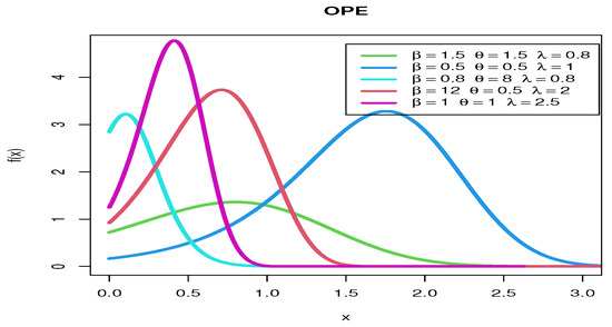 Table 1 provides some numerical values of moments for the OPE model, including , , , , variance (var), skewness (SK), kurtosis (KU), and the coefficient of variation (CV).