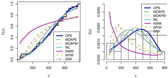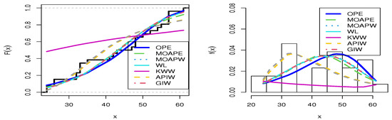 Let us consider the Weibull distribution with cdf and pdf values given by and . The odd Perks–Weibull (OPW) has cdf and pdf given, respectively, by