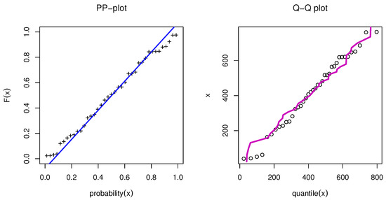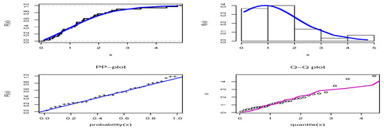 The remainder of this paper is divided into several sections, structured as follows. In Section 2, a useful expansion of -G is derived and some special models are obtained by means of the -G generator. Several mathematical statistical properties, MOMs, probability-weighted moments (PRWMOMs), residual life (RL) and reversed residual life (RRL) FUNs, and entropy (EN) are investigated in Section 3. In Section 4, non-Bayesian estimates of the model’s parameters are obtained. In Section 5, Bayesian estimates of the model’s parameters are obtained. In Section 6, bootstrap confidence intervals for the model’s parameters are obtained. In Section 7, the log-odd Perks–Weibull regression model is introduced. Simulation studies are described in Section 8. Section 9 details the discretization of the -G family. In Section 10, real-world data sets are used to demonstrate the adaptability of the proposed family. Finally, we present our conclusions.