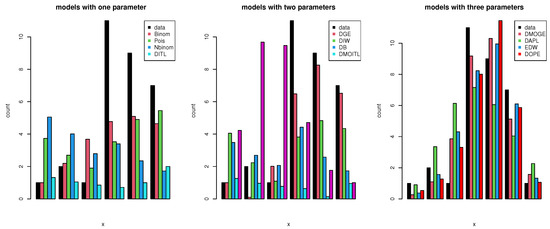 Graphical plots of the expected frequencies and the data obtained using the PMFs of different distributions.