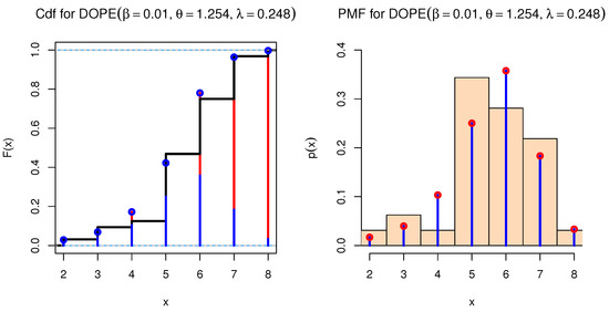 We used a COVID-19 data set from Saudi Arabia that spanned 32 days (from 1 September 2021 to 4 October 2021). This data set was comprised of newly reported instances of daily deaths. The data were as follows: 6, 7, 8, 5, 7, 7, 6, 6, 7, 6, 6, 7, 6, 5, 5, 7, 5, 6, 5, 5, 6, 5, 7, 5, 4, 6, 5, 5, 5, 3, 3, and 2. These data were obtained from the World Health Organization (at https://covid19.who.int/ accessed on 3 March 2022). Table 12 shows the data values, real frequency (count), and frequencies estimated using different discrete distributions. The distributions used for comparison were the discrete Marshall–Olkin inverse Toppe–Leone (DMOITL) introduced by [56], discrete Burr (DB) introduced by [57], discrete inverse Weibull (DIW) introduced by [58], negative binomial distribution (NBinom) introduced by [59], Poisson (Pois), discrete generalized exponential (DGE) suggested by [60], discrete alpha power inverse Lomax (DAPL) introduced by [61], discrete Lindley (DL) introduced by [62], discrete inverse Toppe–Leone (DITL) introduced by [63], exponentiated discrete Weibull introduced by [64], and discrete Marshall–Olkin generalized exponential (DMOGE) introduced by [65]. Figure 13 shows that the DOPE distribution was the best model for fitting these data, with an estimated frequency close to the real frequency. To confirm this conclusion, we used the KS value and Chi-squared () test to determine the best model fit for these data, as well as the AKINC, CAKINC, BINC, and HQINC measures. The results are shown in Table 13. We note that all of these measures had the smallest values with the DOPE distribution. Figure 14 shows the cdf and PMF for the DOPE distribution of these data.