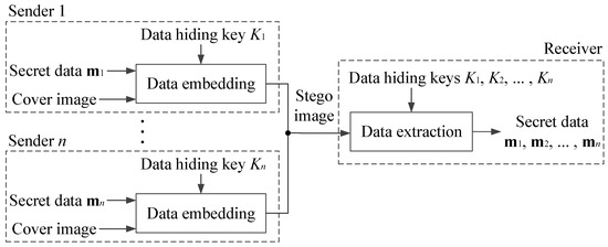 The procedure of the proposed separable multisource data-hiding scheme is shown in Figure 2. For n senders, the i-th sender can transmit the i-th secret data to the receiver using the i-th data-hiding key , but is unable to know the content of other parts of secret data without the symmetrical (correct) data-hiding key, .