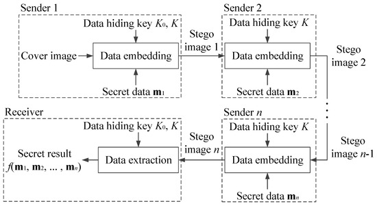 In some tasks such as anonymous voting, only the final result is necessary instead of the ballot content of each voter. In this case, the content of each secret data transmitted by multiple senders is unnecessary to the receiver. To this end, we propose an anonymous multisource data-hiding scheme, in which the data extracted by the receiver are a co-determined result of all secret data instead of the details. The procedure of the proposed scheme is shown in Figure 3, in which data embedding is executed in sequence, and data extraction is executed after the last embedding operation. The n senders sequentially embeds secret bits into a given cover image using the same data-hiding key K. On the receiver side, a co-determined result of is extracted, while the details of each kept unknown. This is achieved by the data-hiding key , which is only held by receiver and the first sender symmetrically. Details are as follows.