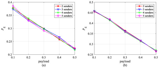 For the cases of a different quantity of senders, the undetectability (values of ) of the proposed separable multisource data-hiding scheme is shown in Figure 4, where the horizontal axis represents the embedding payload (bits per pixel), secret data are embedded using the baseline embedding algorithm HILL. The results indicate that values of are approximate to each other with different number of senders. The slight fluctuation is caused by the randomness of testing, which means that the undetectability performance is independent of the number of senders. The reason is that undetectability is determined by the embedding algorithm and payload, which is always bits per pixel for different number of senders; therefore, an increment on the quantity of senders will not change the undetectability of the data hiding.